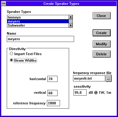 Once the frequency response, sensitivity, and directivity pattern have been set, give the speaker type a unique name--usually containing the brand and model name--and press Create. If there are any errors in the settings or files, they will be detected and a message will be issued. At this point the speaker type is loaded into WinSound and can be used in placing speakers. Its name appears in the Speaker Types list box. Double-clicking this name will fill the dialog with the properties of that type.