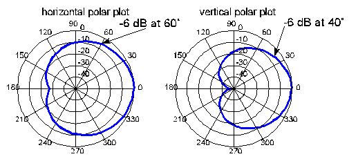 This says that in the horizontal plane at 60° (i.e., half of 120°) off the front axis the sound intensity is 6 dB lower than directly in front of the speaker. Likewise, in the vertical plane the intensity is 6 dB lower at 40° (i.e., half of 80°) off the front axis. The "6-dB-down angle" is half the beam width because the "beam" includes both sides of the axis. For instance, if we took our example speaker with its sensitivity of 95 dB and put one watt through it, we would measure 95 dB at one meter directly in front of it. Now suppose we walked around it 60° to one side so that we measure one meter away. Now our reading would be 95 - 6 = 89 dB. Alternatively, we could move the microphone up 40° above the center axis and again read 89 dB. The former reading is the "off-axis response" in the horizontal plane, and the reading could be repeated at all angles in this plane. Likewise, the latter reading is in the vertical plane, and the "off-axis response" could be measured at all angles in that plane. To show these measurements we would use "polar patterns" for the two planes. These polar patterns would look like the following:
